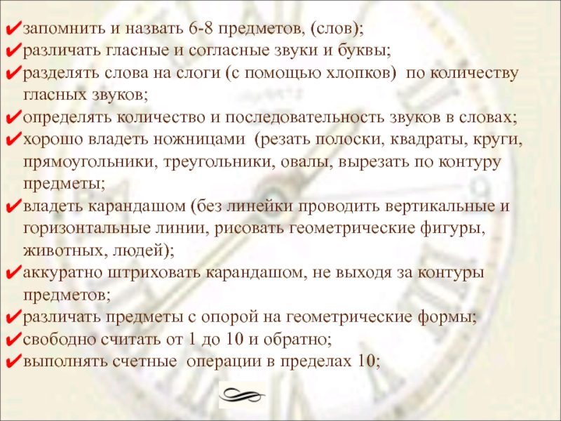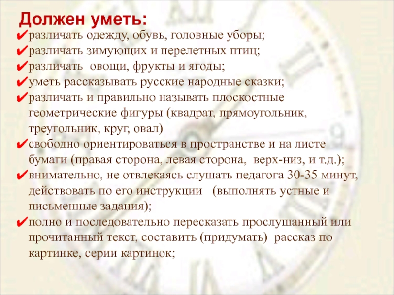 внимательно, не отвлекаясь слушать педагога 30-35 минут, действовать по его инструкции (выполнять устные и письменные задания);