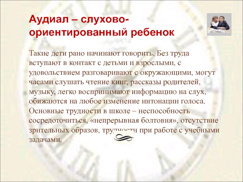 Слайд 5Аудиал – слухово-ориентированный ребенок