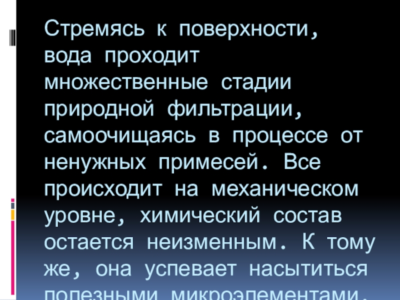 Слайд 5Стремясь к поверхности, вода проходит множественные стадии природной фильтрации, самоочищаясь в