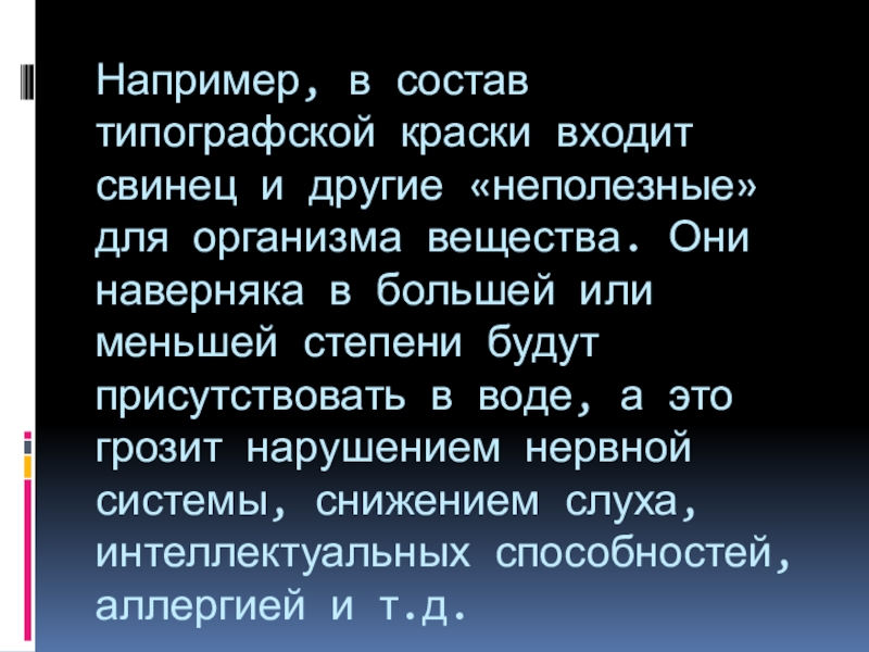 Слайд 22Например, в состав типографской краски входит свинец и другие «неполезные» для