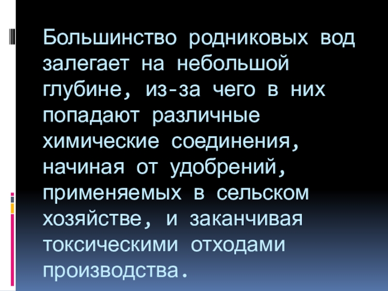Слайд 31Большинство родниковых вод залегает на небольшой глубине, из-за чего в них