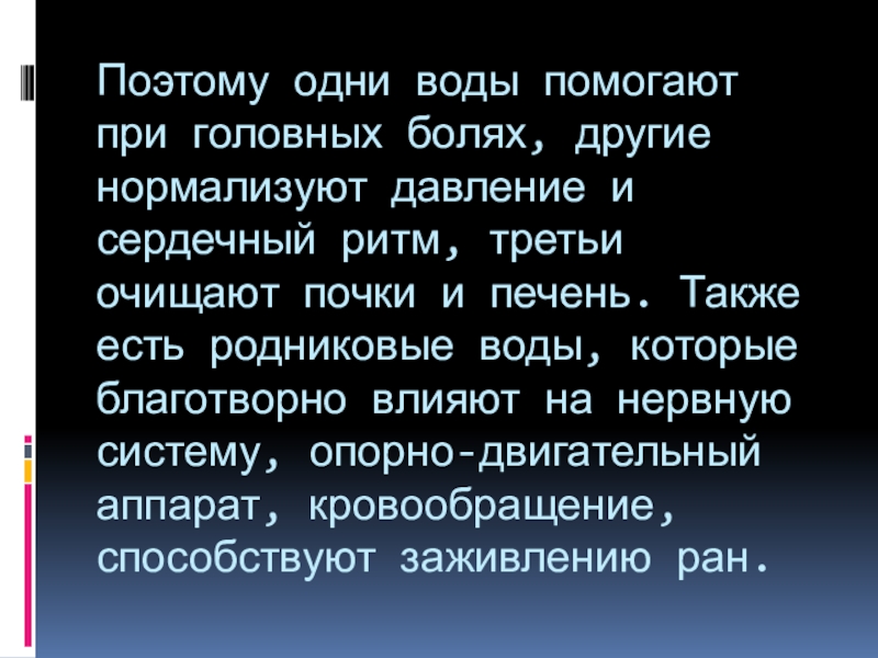 Слайд 29Поэтому одни воды помогают при головных болях, другие нормализуют давление и