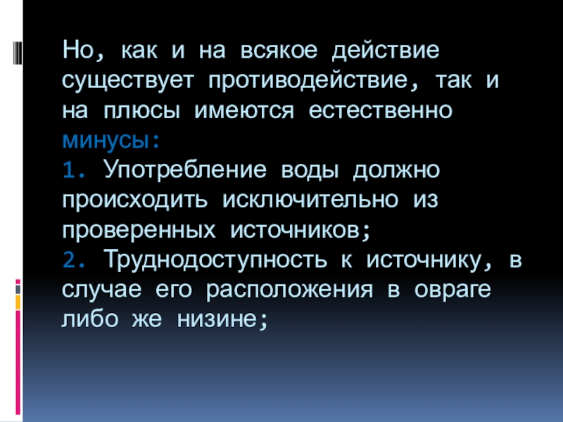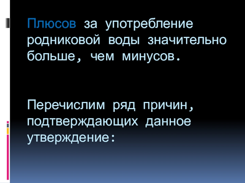 Слайд 6Плюсов за употребление родниковой воды значительно больше, чем минусов.