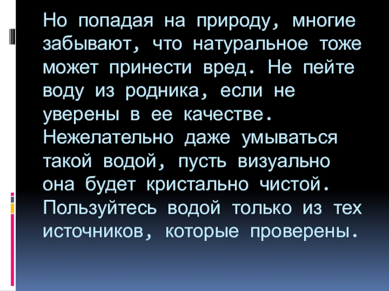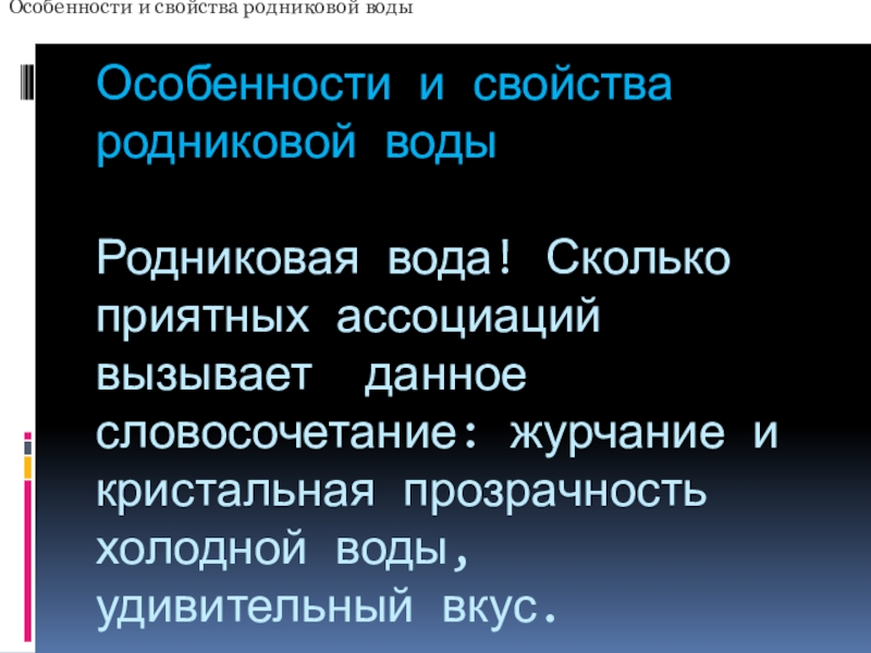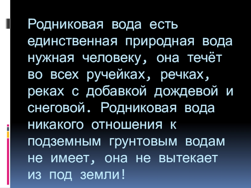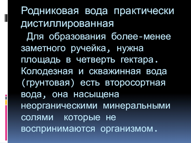 Слайд 14Родниковая вода есть единственная природная вода нужная человеку, она течёт во