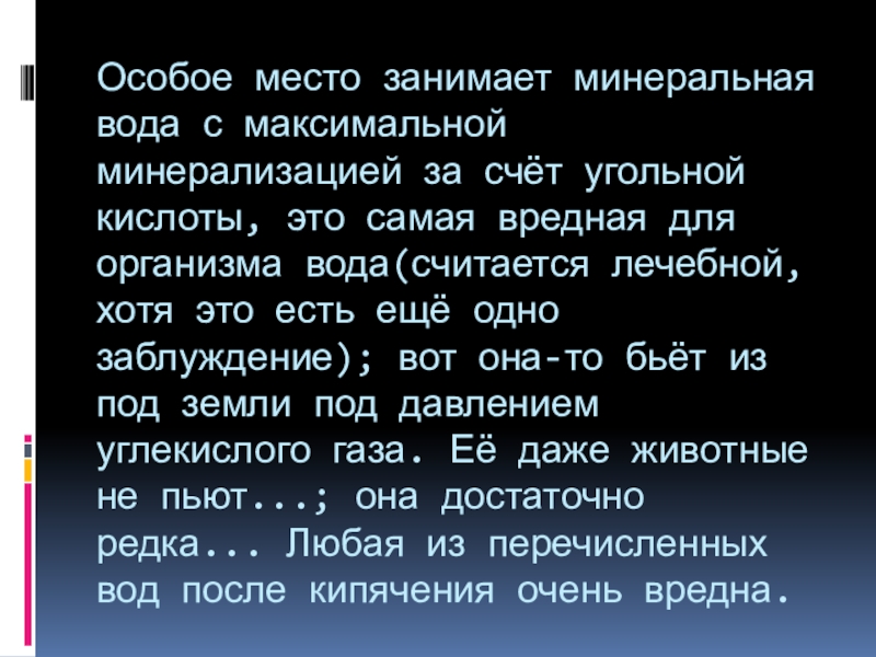 Слайд 16Особое место занимает минеральная вода с максимальной минерализацией за счёт угольной