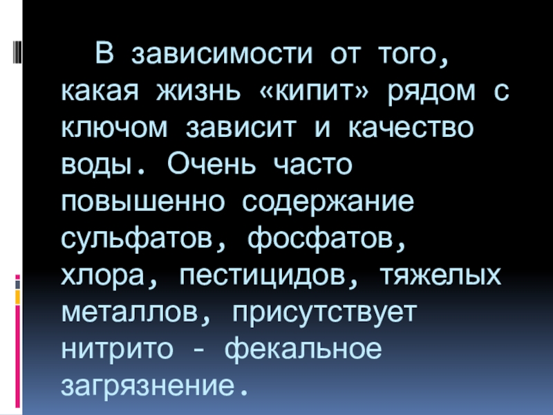 зависит и качество воды. Очень часто повышенно содержание сульфатов, фосфатов, хлора, пестицидов, тяжелых металлов, присутствует нитрито - фекальное загрязнение.