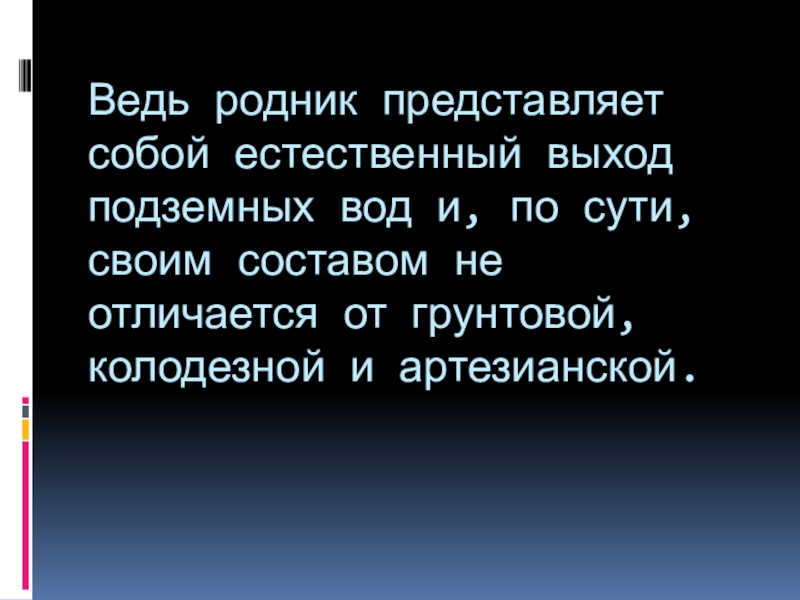 Слайд 4Ведь родник представляет собой естественный выход подземных вод и, по сути,