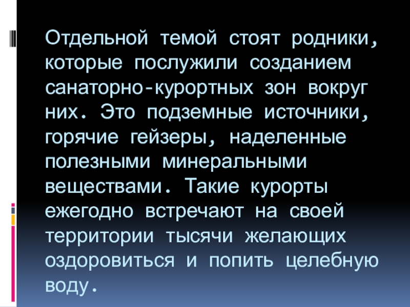 Слайд 13Отдельной темой стоят родники, которые послужили созданием санаторно-курортных зон вокруг них.