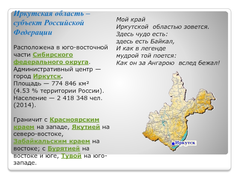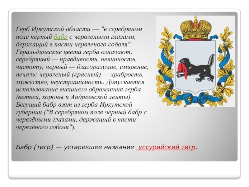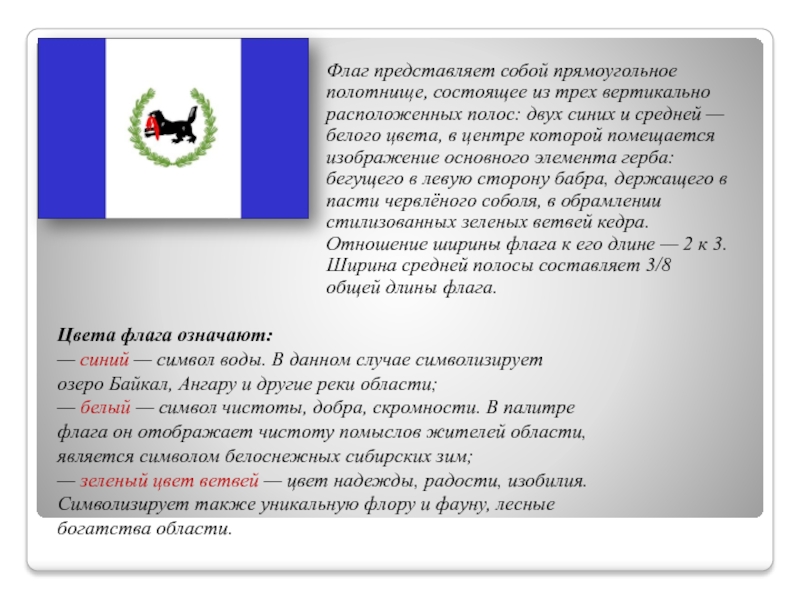 — синий — символ воды. В данном случае символизирует озеро Байкал, Ангару и другие реки области;