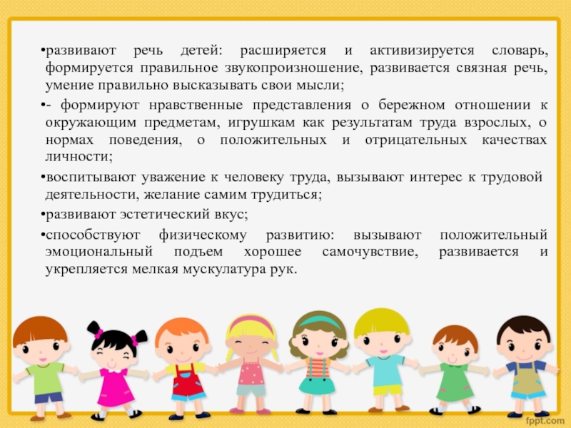 воспитывают уважение к человеку труда, вызывают интерес к трудовой деятельности, желание самим трудиться;