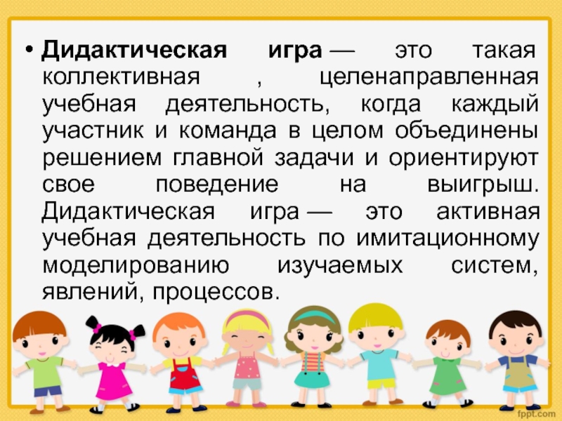 участник и команда в целом объединены решением главной задачи и ориентируют свое поведение на выигрыш. Дидактическая игра — это активная учебная деятельность по имитационному моделированию изучаемых систем, явлений, процессов.