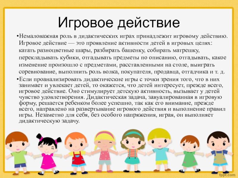 Немаловажная роль в дидактических играх принадлежит игровому действию. Игровое действие