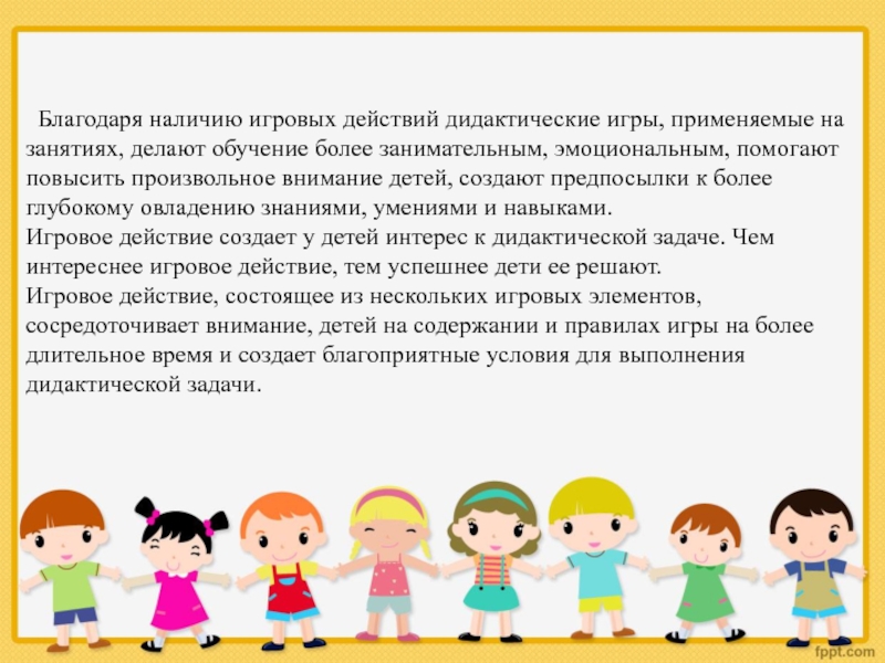 Слайд 10 Благодаря наличию игровых действий дидактические игры, применяемые на занятиях, делают