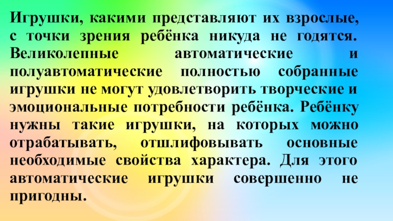 годятся. Великолепные автоматические и полуавтоматические полностью собранные игрушки не могут удовлетворить творческие и эмоциональные потребности ребёнка. Ребёнку нужны такие игрушки, на которых можно отрабатывать, отшлифовывать основные необходимые свойства характера. Для этого автоматические игрушки совершенно не пригодны.