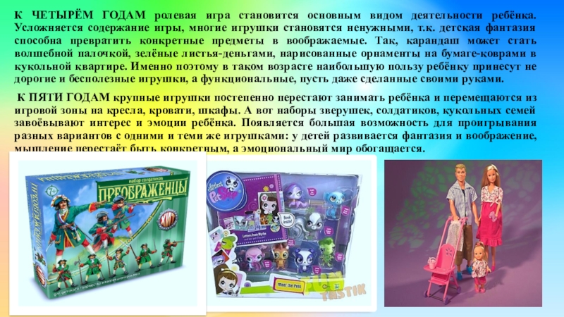 содержание игры, многие игрушки становятся ненужными, т.к. детская фантазия способна превратить конкретные предметы в воображаемые. Так, карандаш может стать волшебной палочкой, зелёные листья-деньгами, нарисованные орнаменты на бумаге-коврами в кукольной квартире. Именно поэтому в таком возрасте наибольшую пользу ребёнку принесут не дорогие и бесполезные игрушки, а функциональные, пусть даже сделанные своими руками.