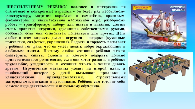 он будет рад необычному конструктору, моделям кораблей и самолётов, красивым фломастерам и занимательной настольной игре, разборному роботу – трансформеру, набору для шитья и вязания. Детям очень нравятся игрушки, сделанные собственными руками, особенно, если они становятся полезными для других. Дети любят в этом возрасте делать игрушки – подарки (кухонные прихватки, салфетки, украшения). Радость и гордость вызывает у ребёнка тот факт, что он умеет делать добро окружающим и любимым людям. Поэтому любое желание ребёнка что-то смастерить, сшить, склеить и кому-то подарить должно приветствоваться родителями, если они хотят развить в ребёнке трудолюбие, усидчивость и желание что-то в жизни давать другим. Игрушечные магазины уходят на второй план, а наибольший интерес у детей вызывают прилавки с канцелярскими принадлежностями, строительными материалами, нитками и пуговицами. Ребёнок сам готовит себя к смене вида деятельности и школьному обучению.