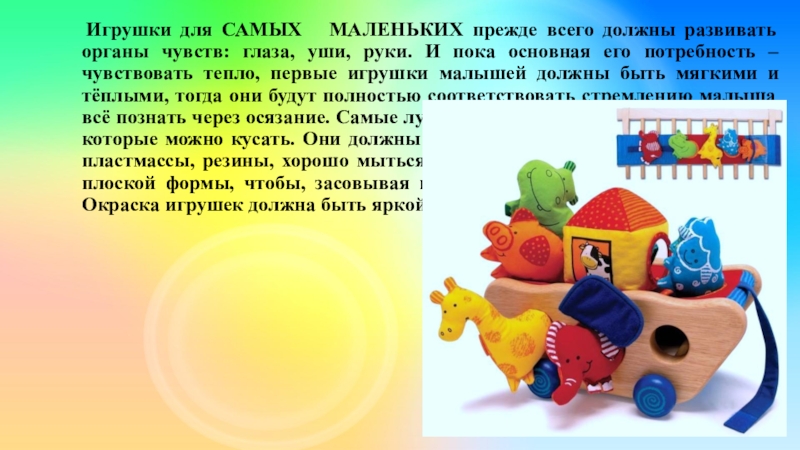 Слайд 9 Игрушки для САМЫХ МАЛЕНЬКИХ прежде всего должны развивать органы чувств: