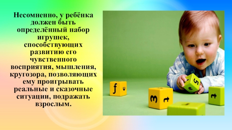 Слайд 5Несомненно, у ребёнка должен быть определённый набор игрушек, способствующих развитию его
