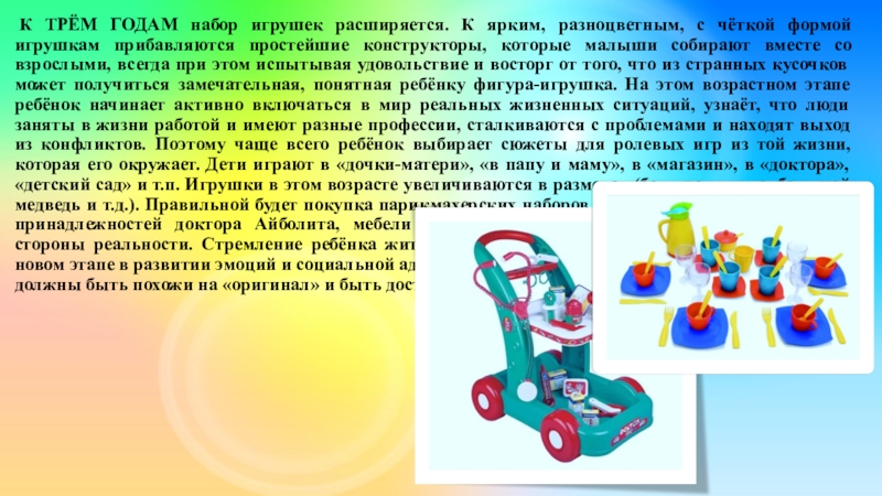 Слайд 12 К ТРЁМ ГОДАМ набор игрушек расширяется. К ярким, разноцветным, с чёткой
