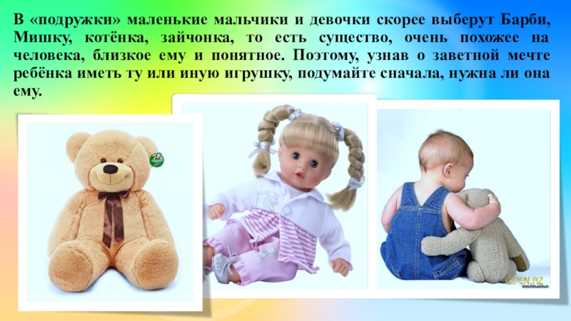Слайд 4В «подружки» маленькие мальчики и девочки скорее выберут Барби, Мишку, котёнка,