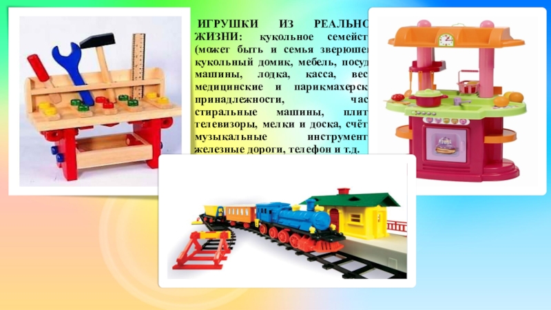 кукольный домик, мебель, посуда, машины, лодка, касса, весы, медицинские и парикмахерские принадлежности, часы, стиральные машины, плиты, телевизоры, мелки и доска, счёты, музыкальные инструменты, железные дороги, телефон и т.д.