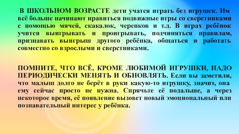 Слайд 15 В ШКОЛЬНОМ ВОЗРАСТЕ дети учатся играть без игрушек. Им всё больше