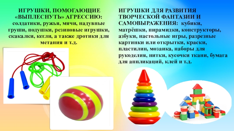 Слайд 7 ИГРУШКИ, ПОМОГАЮЩИЕ «ВЫПЛЕСНУТЬ» АГРЕССИЮ: солдатики, ружья, мячи, надувные груши, подушки, резиновые