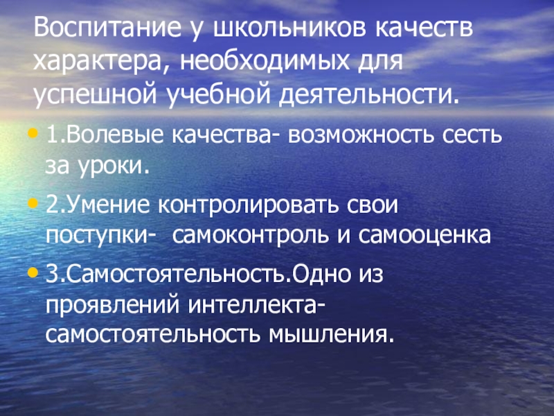 Воспитание у школьников качеств характера, необходимых для успешной учебной деятельности.1.Волевые качества- возможность сесть за уроки.2.Умение контролировать свои