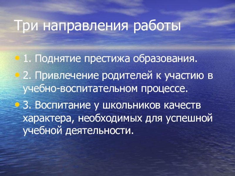 Три направления работы1. Поднятие престижа образования.2. Привлечение родителей к участию в учебно-воспитательном процессе.3. Воспитание у школьников качеств характера, необходимых для успешной учебной деятельности.