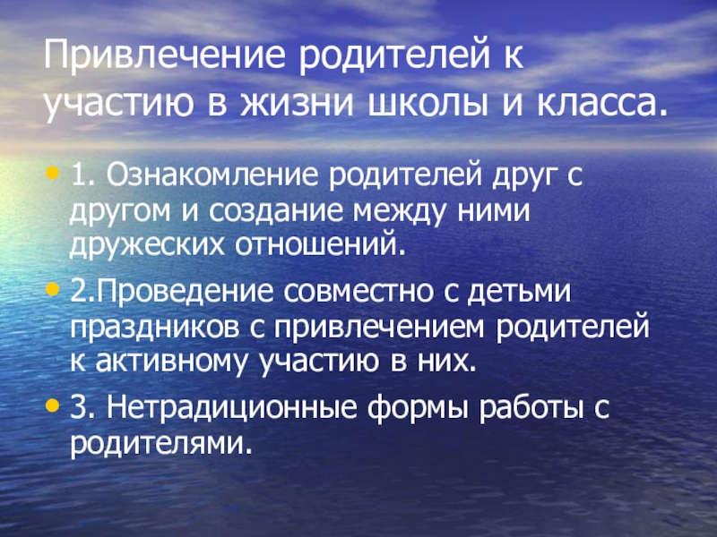 Слайд 4Привлечение родителей к участию в жизни школы и класса.