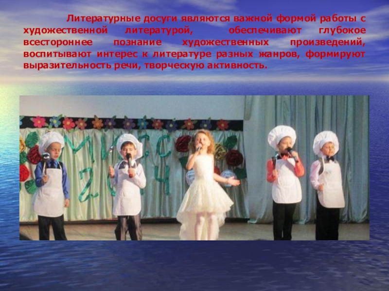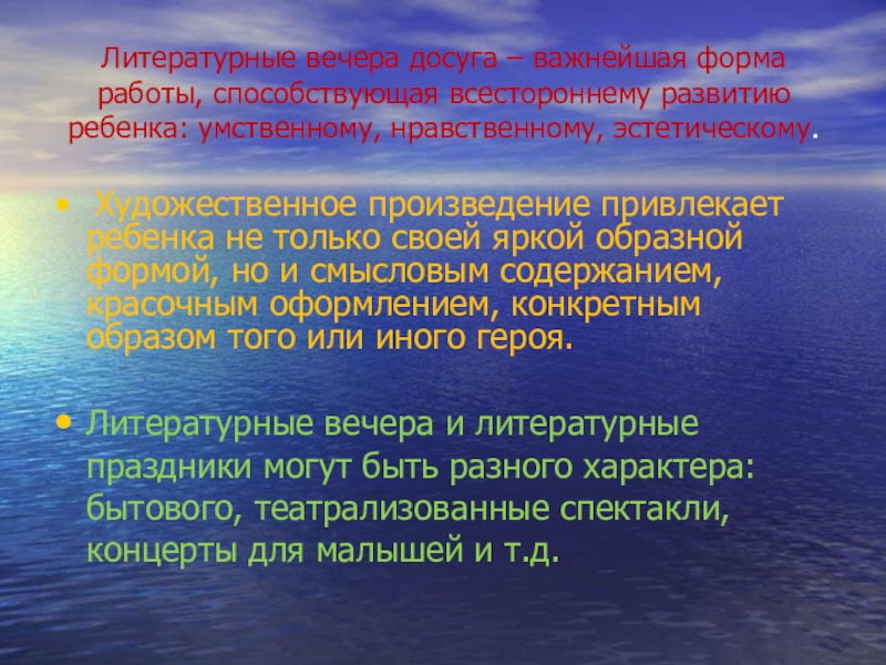 Литературные вечера и литературные праздники могут быть разного характера: бытового, театрализованные спектакли, концерты для малышей и т.д.