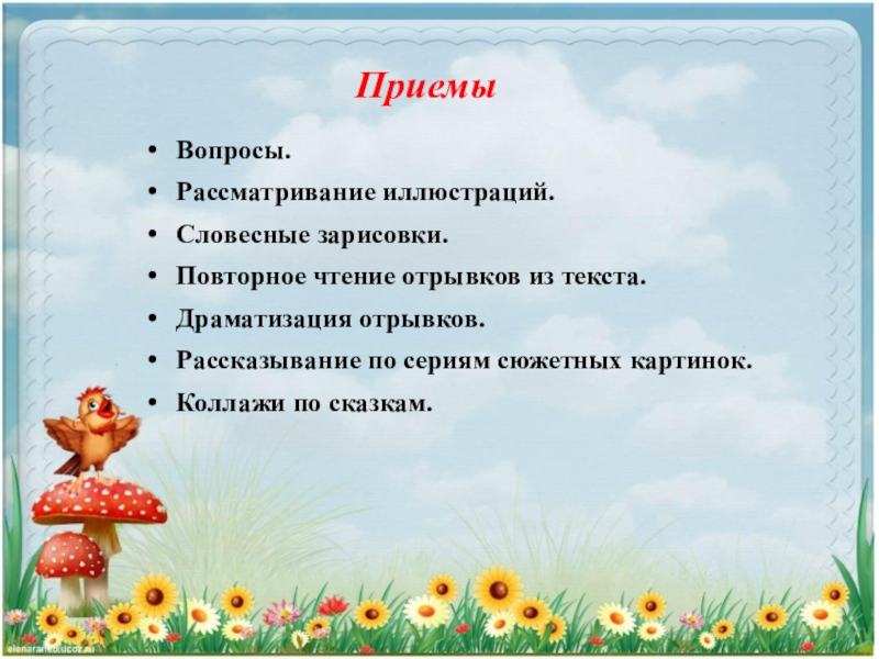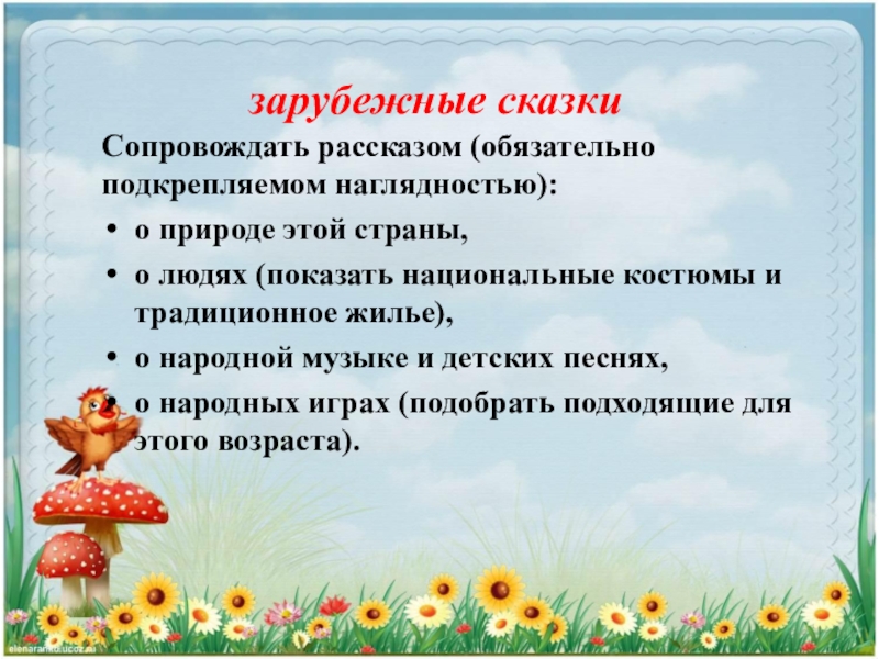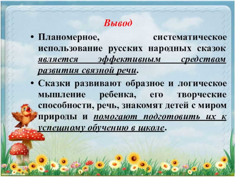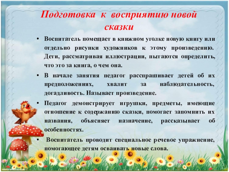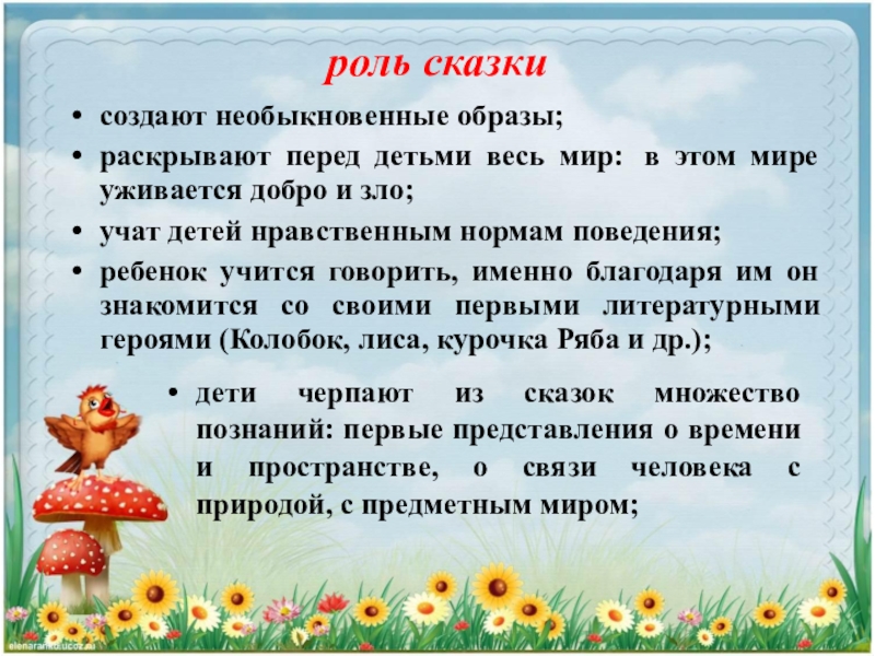 дети черпают из сказок множество познаний: первые представления о времени и пространстве, о связи человека с природой, с предметным миром;