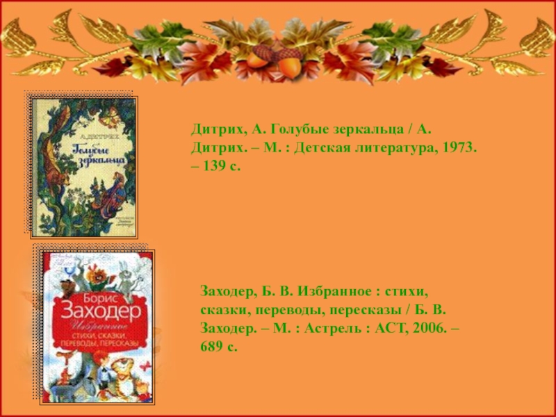 Слайд 13Дитрих, А. Голубые зеркальца / А. Дитрих. – М. : Детская