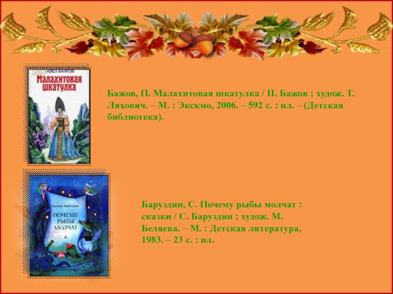 Слайд 11Бажов, П. Малахитовая шкатулка / П. Бажов ; худож. Т. Ляхович.
