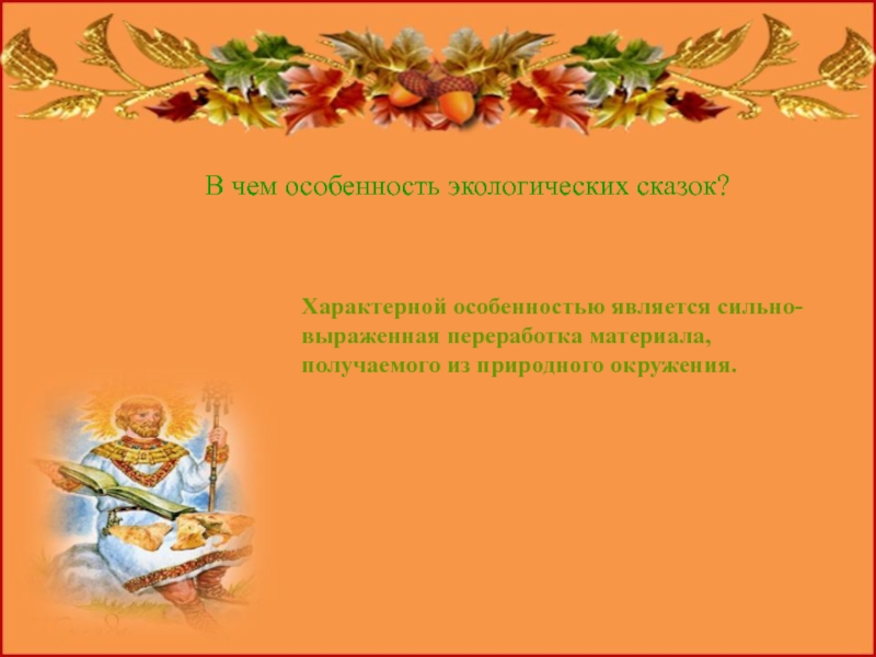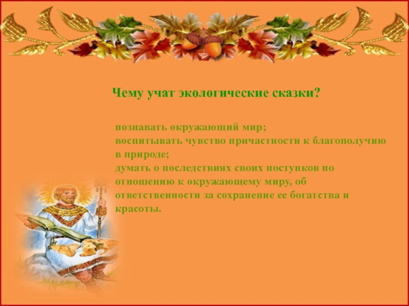 Слайд 20Экологические сказки способствуют развитию у детей творчества, душевности, умения замечать прекрасное