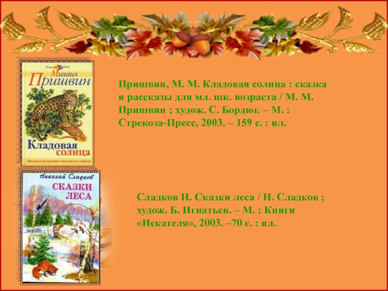 Слайд 17Пришвин, М. М. Кладовая солнца : сказка и рассказы для мл.