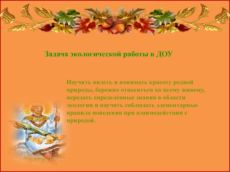 природы, бережно относиться ко всему живому, передать определенные знания в области экологии и научить соблюдать элементарные правила поведения при взаимодействии с природой.