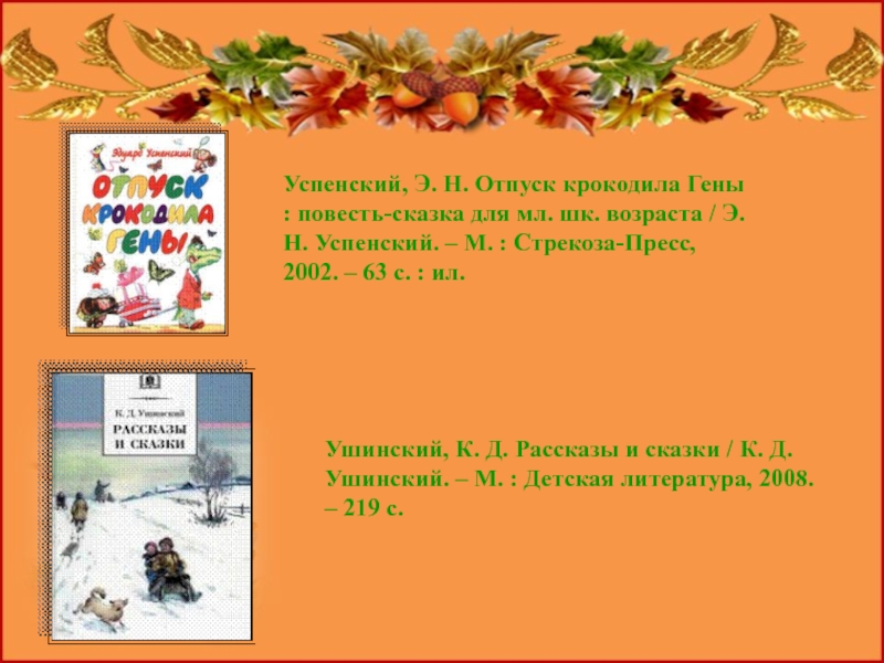 Слайд 19Успенский, Э. Н. Отпуск крокодила Гены : повесть-сказка для мл. шк.