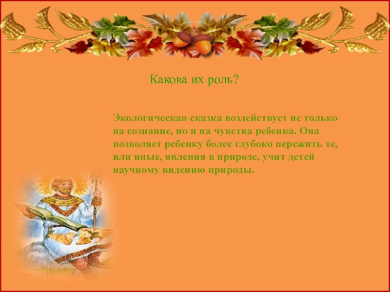 Слайд 1РОЛЬ СКАЗОК В ЭКОЛОГИЧЕСКОМ ВОСПИТАНИИ ДОШКОЛЬНИКОВ