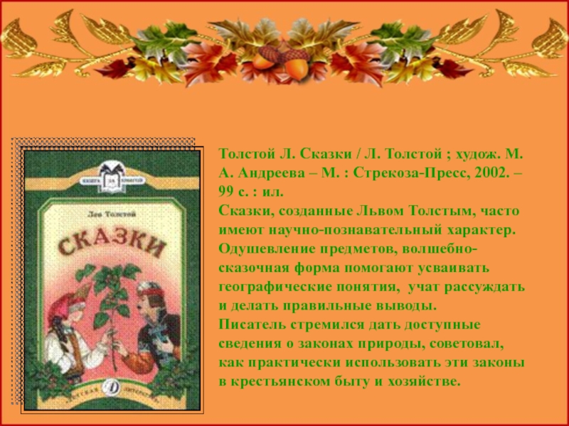 Слайд 18Толстой Л. Сказки / Л. Толстой ; худож. М. А. Андреева