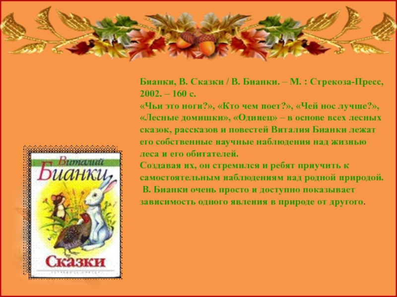 Слайд 12Бианки, В. Сказки / В. Бианки. – М. : Стрекоза-Пресс, 2002.