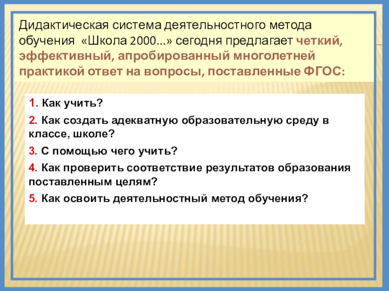 Слайд 4Дидактическая система деятельностного метода обучения «Школа 2000...» сегодня предлагает четкий, эффективный,