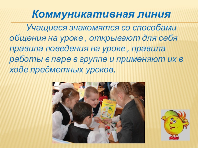 Учащиеся знакомятся со способами общения на уроке , открывают для себя правила поведения на уроке , правила работы в паре в группе и применяют их в ходе предметных уроков.