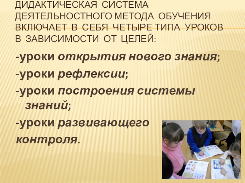 Слайд 24Дидактическая система деятельностного метода обучения включает в себя четыре типа уроков