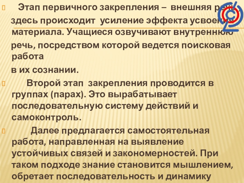 Слайд 7 Этап первичного закрепления – внешняя речь ,