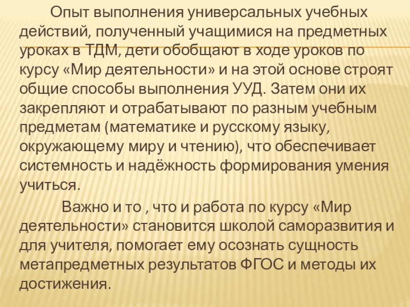 действий, полученный учащимися на предметных уроках в ТДМ, дети обобщают в ходе уроков по курсу «Мир деятельности» и на этой основе строят общие способы выполнения УУД. Затем они их закрепляют и отрабатывают по разным учебным предметам (математике и русскому языку, окружающему миру и чтению), что обеспечивает системность и надёжность формирования умения учиться.
