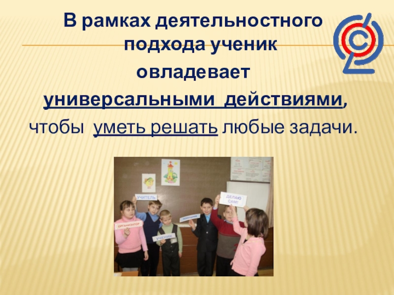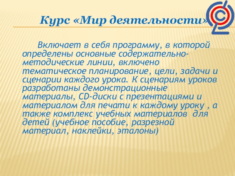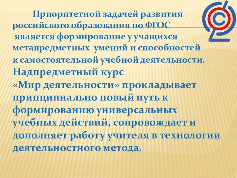 «Мир деятельности» прокладывает принципиально новый путь к формированию универсальных учебных действий, сопровождает и дополняет работу учителя в технологии деятельностного метода.