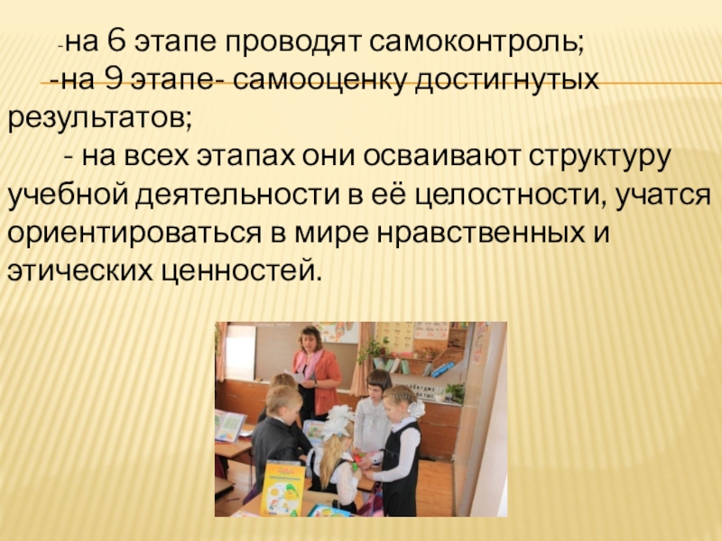 - на всех этапах они осваивают структуру учебной деятельности в её целостности, учатся ориентироваться в мире нравственных и этических ценностей.