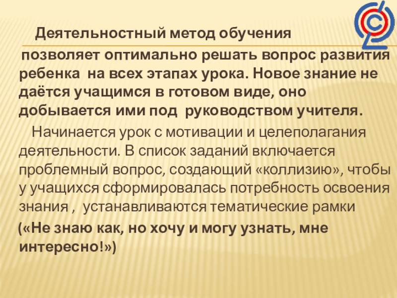 позволяет оптимально решать вопрос развития ребенка на всех этапах урока. Новое знание не даётся учащимся в готовом виде, оно добывается ими под руководством учителя.