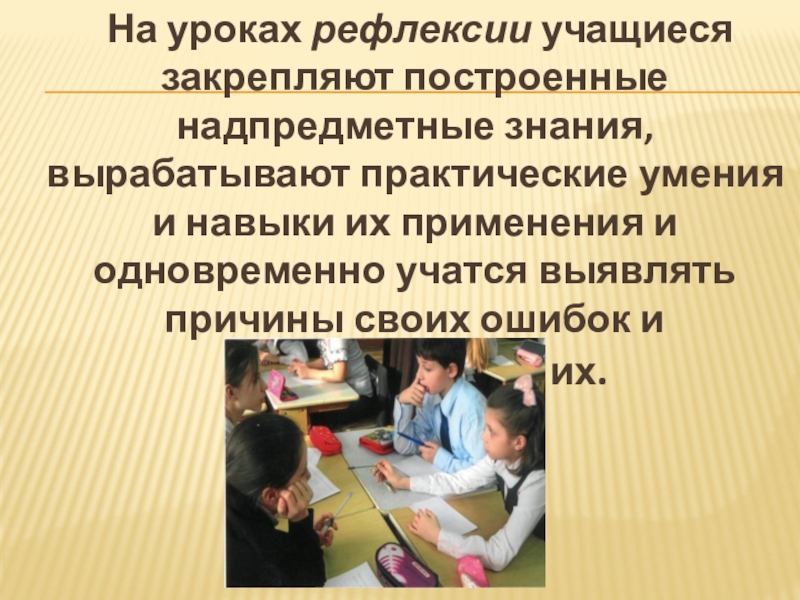 Слайд 26 На уроках рефлексии учащиеся закрепляют построенные надпредметные знания, вырабатывают